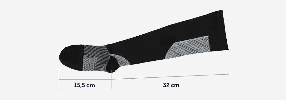 Strumporna är som bredast längst upp följt av en graderad och ökande kompression längs med vaden mot ankeln. Den omslutande hälkoppen ger extra stabilitet.